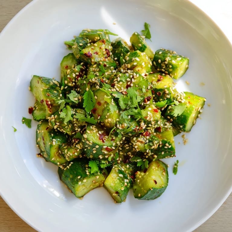 I made this for a potluck dinner once and watched people reach for seconds before they'd finished chewing their first bite. Someone asked if I'd bought it at a restaurant, and I remember feeling genuinely proud standing there with my colander and a bowl of garlicky sesame-scented cucumbers. That's when I knew this wasn't just a summer side dish—it was something worth making intentionally.