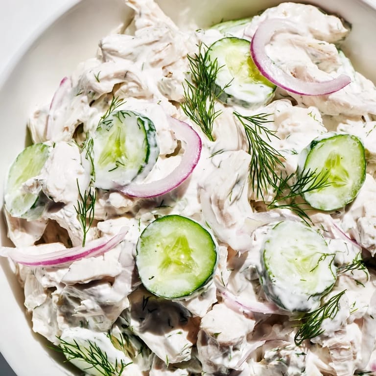 Save This Creamy Cucumber Chicken Salad is a refreshing and protein-packed dish that features tender chicken and crisp cucumbers tossed in a velvety dill yogurt dressing. Perfect for a light lunch or a vibrant summer meal, it offers a satisfying crunch and bright flavors in every bite.