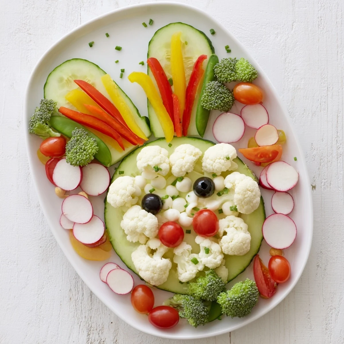 - 5. Surround the bunny shape with the remaining vegetables, arranging them in clusters for color and variety.