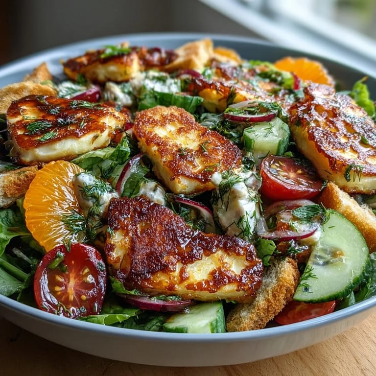 Prepare the dressing and croutons in advance, but fry the halloumi just before serving for optimal texture. Assemble everything immediately before eating to prevent the croutons from becoming soggy.