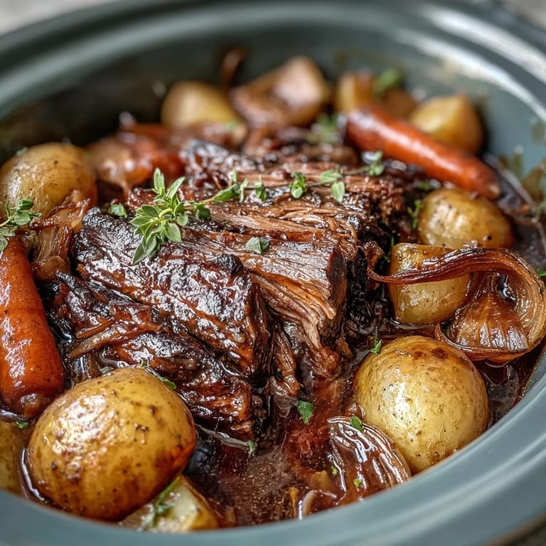 Save There's something magical about opening the slow cooker lid after eight hours and having the aroma of caramelized onions and tender beef hit you like a warm hug. My grandmother used to make pot roast in her ancient electric cooker, but it wasn't until I discovered the shortcut of onion soup mix that I realized you didn't need hours of fussing to achieve that same depth of flavor. One Sunday afternoon, running late and desperate to have dinner ready, I threw everything together and realized this humble packet was doing the heavy lifting that used to require constant attention. That's when pot roast became my go-to remedy for chaos, the kind of meal that quietly takes care of itself while you handle everything else.
