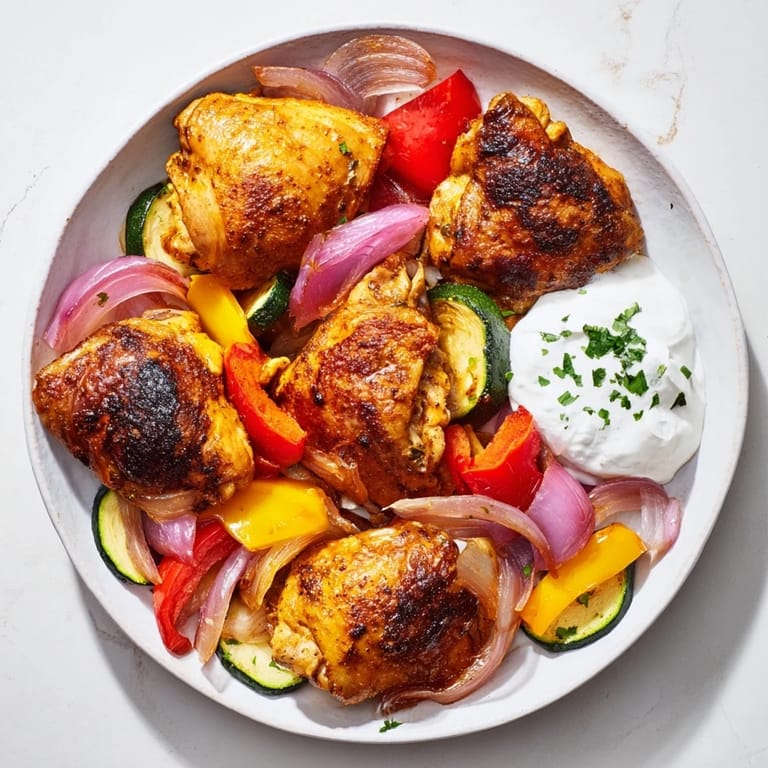 Substitute chicken thighs with chicken breasts if you prefer, but reduce cooking time by 5 minutes to avoid drying out the meat. To make this recipe dairy-free, simply omit the yogurt sauce or replace it with a plant-based yogurt alternative.