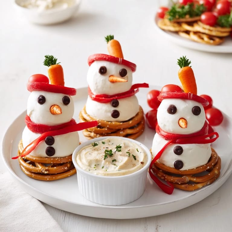 Arrange the pretzel snowmen neatly on a large platter with bowls of dips nearby, garnished with fresh parsley sprigs and halved cherry tomatoes for color.