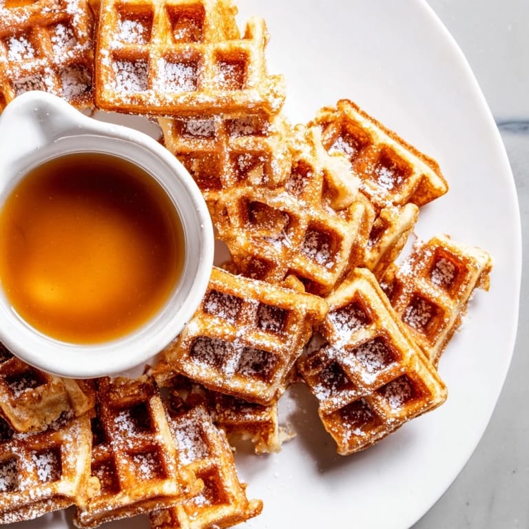 Save Crispy, golden waffle quarters served with a sweet maple syrup dip—perfect for a fun, hands-on breakfast or brunch treat.